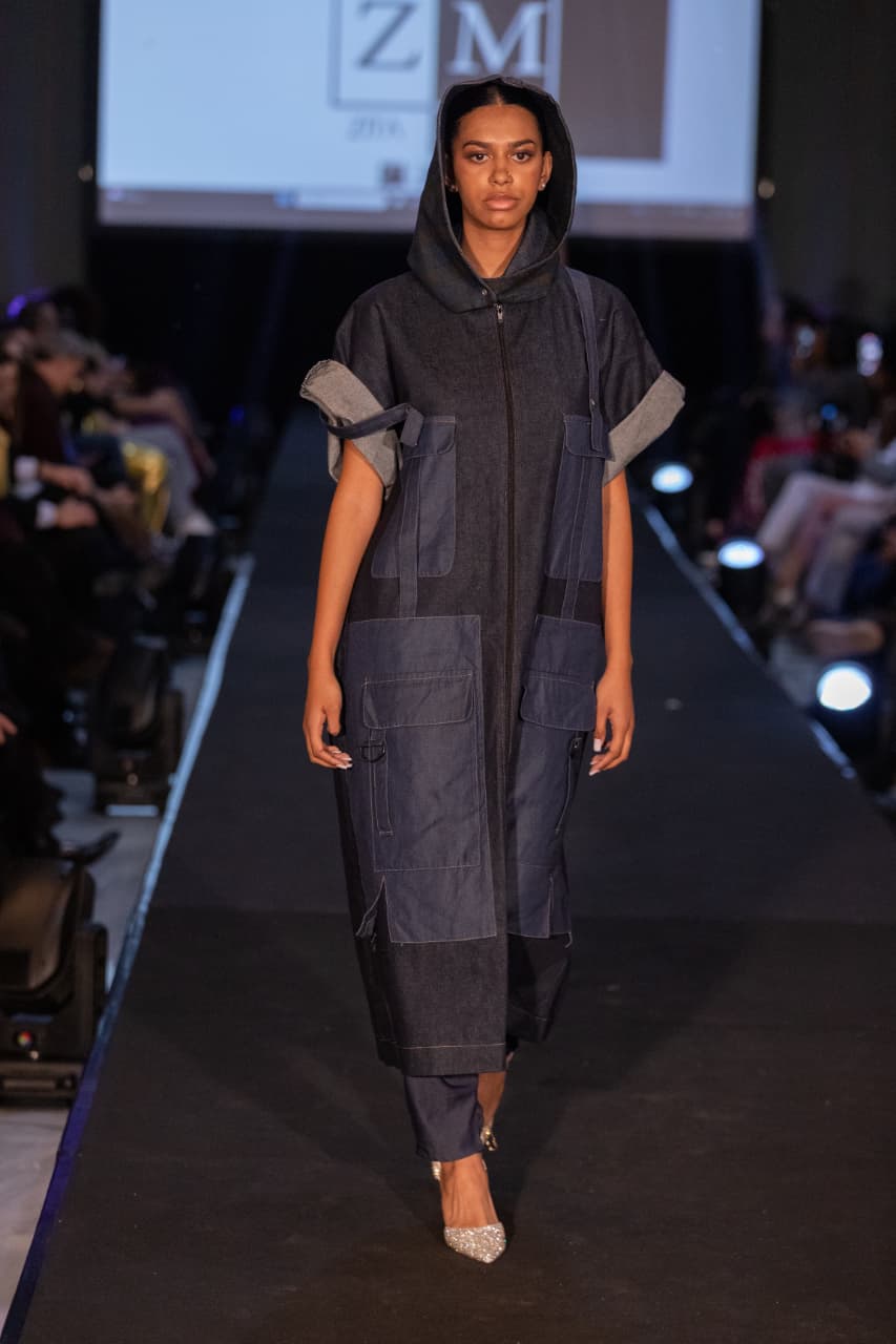 A masterclass in tonal structuralism, this look features a full-length hooded denim jumpsuit/tunic constructed from multi-tonal raw indigo denim. The design incorporates a fully detachable high-neck hood, allowing the wearer to transition from a total sensory shield to a streamlined open-collar silhouette. Oversized industrial cargo pockets introduce rhythmic, weighted geometry across the elongated frame, reinforcing the garment’s architectural utility aesthetic.