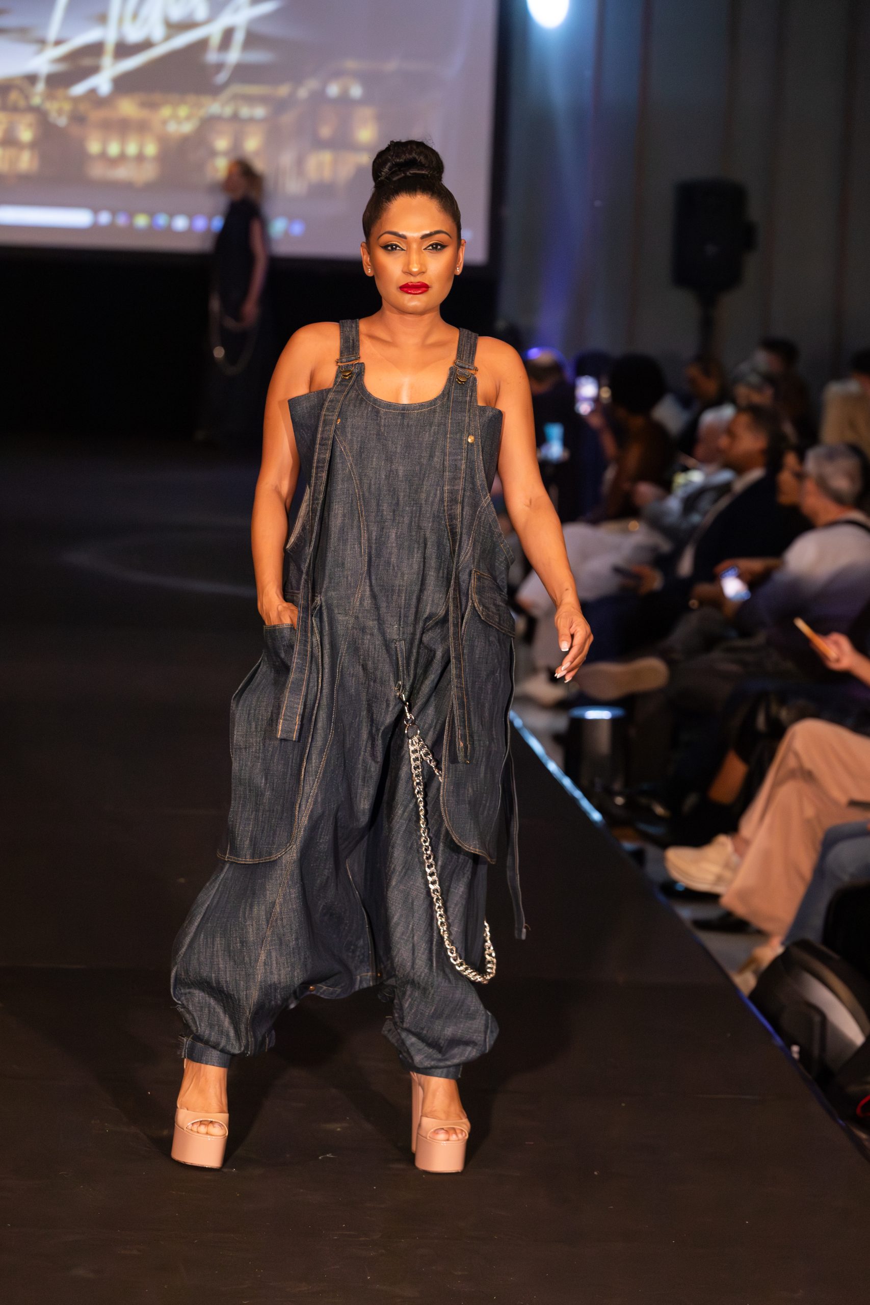 An exploration of exaggerated space and structural form, this look redefines the traditional overall through a voluminous drop-crotch silhouette and cuffed tapered ankles. Constructed from heavyweight raw indigo denim, the garment features architectural harness-style straps and a sweeping industrial silver chain that anchors the design visually and structurally. Deep utility pockets are integrated into the side seams, reinforcing both function and durability. Designed to be worn by any gender as either a jumpsuit or a dress, the silhouette embraces movement and rejects restriction, creating a bold statement of resilience and non-conformity.